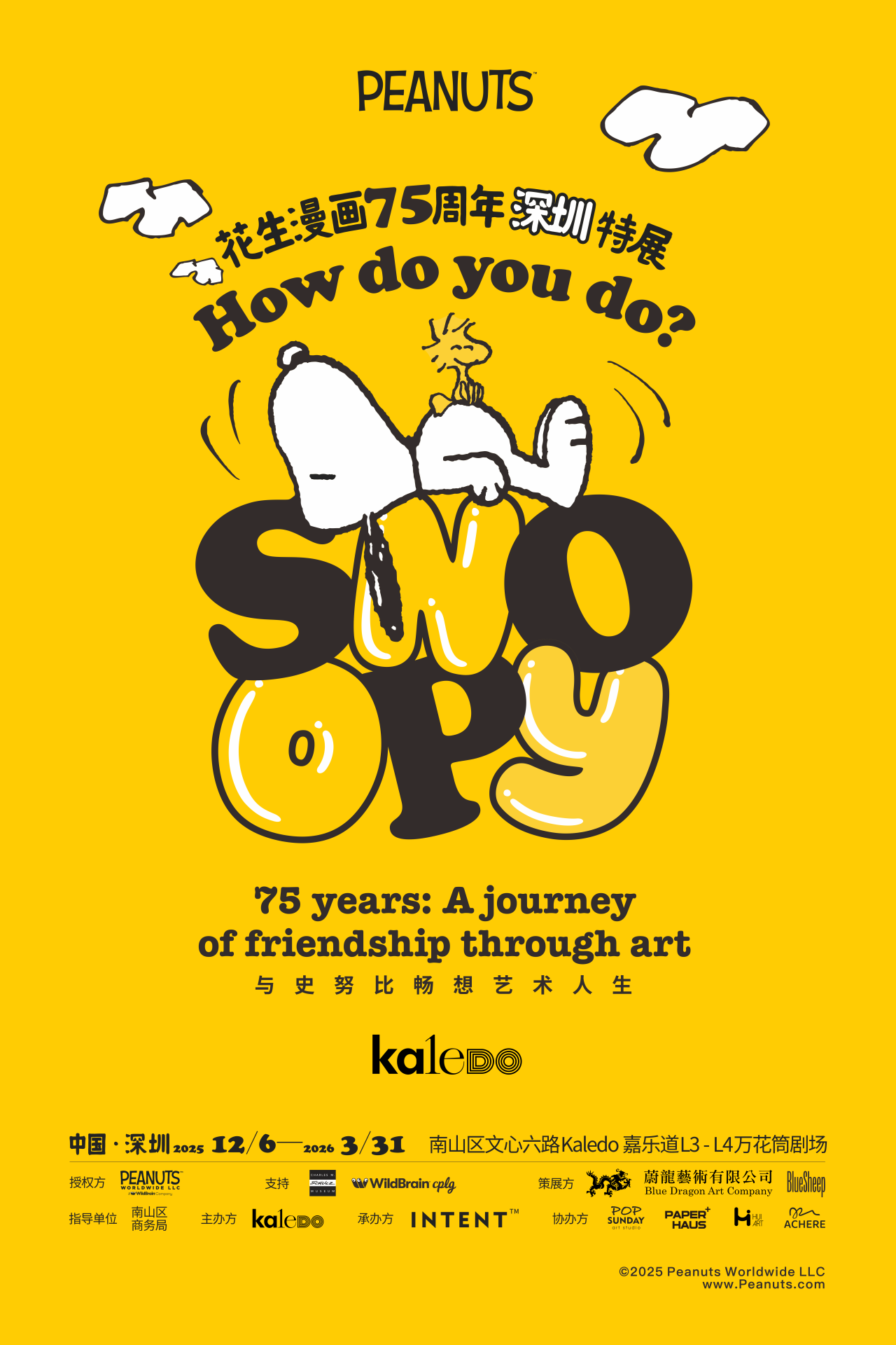 看点:继中国台北、泰国曼谷的亚洲巡回展之后:《HOW DO YOU DO,SNOOPY? 花生漫画75周年特展》正式抵达中国内地首站深圳站,再一次走进史努比的世界,重温查尔斯·舒尔兹所带来的温暖、幽默与永恒想象。本次特展由 PEANUTS WORLDWIDE LLC 官方授权,蔚龙艺术王玉龄担任总策划、美国查尔斯,舒尔兹博物馆共同合作策划,并邀请东京史努比博物馆创意总监草刈大介共同参与策展。