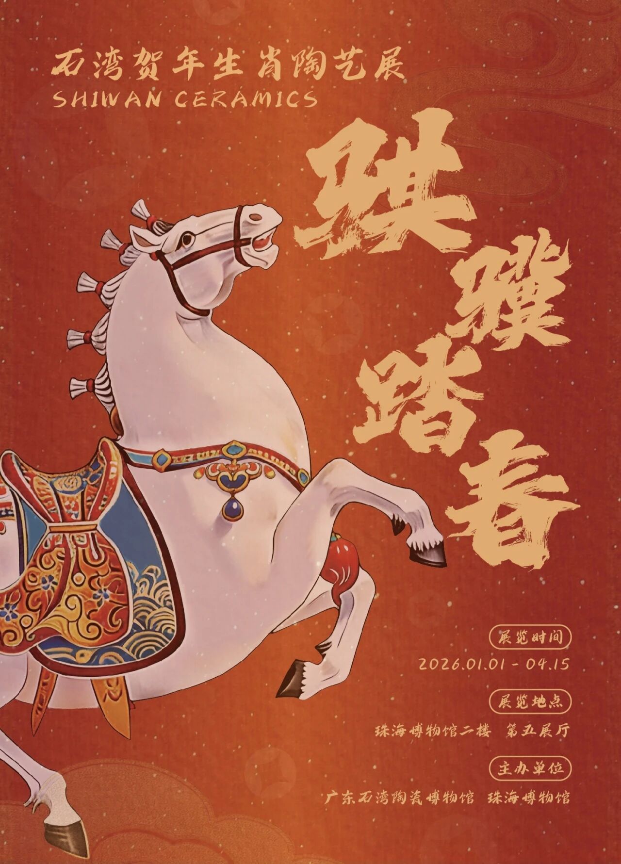 看点:石湾贺年生肖陶艺展已连续举办十七年,成为石湾陶文化品牌的一大亮点。本次展览由广东石湾陶瓷博物馆、珠海博物馆主办,以“马”为主题,集中展示60件(套)由石湾陶艺家于2025年精心创作的马年生肖陶艺作品。展览以生肖文化与年俗传统为脉络,通过陶塑艺术生动诠释马的形象与精神内涵,以陶为媒,以马为题,融釉色之美、造型之韵、文化之魂于一体,营造出吉祥、喜庆的节日氛围。我们诚邀您走进这场承载匠心与祝福的陶艺之旅,在骐骥腾跃的意象中,感受石湾陶艺的生动传神,共迎充满希冀的春天。